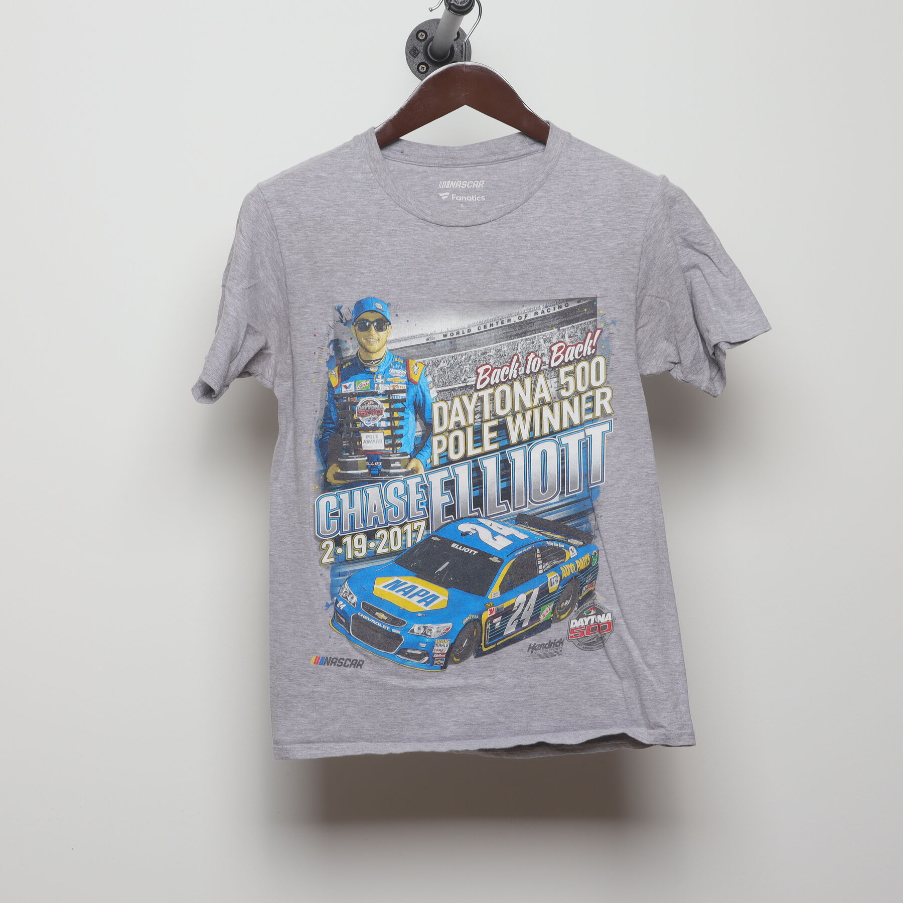 Feel the roar of the engines with this commemorative tee celebrating Chase Elliott's incredible back-to-back pole position wins at the 2017 Daytona 500. This shirt captures a snapshot of modern NASCAR history, featuring Elliott hoisting his trophy alongside his iconic #24 NAPA Chevrolet. It's a piece of high-octane history from the World Center of Racing.