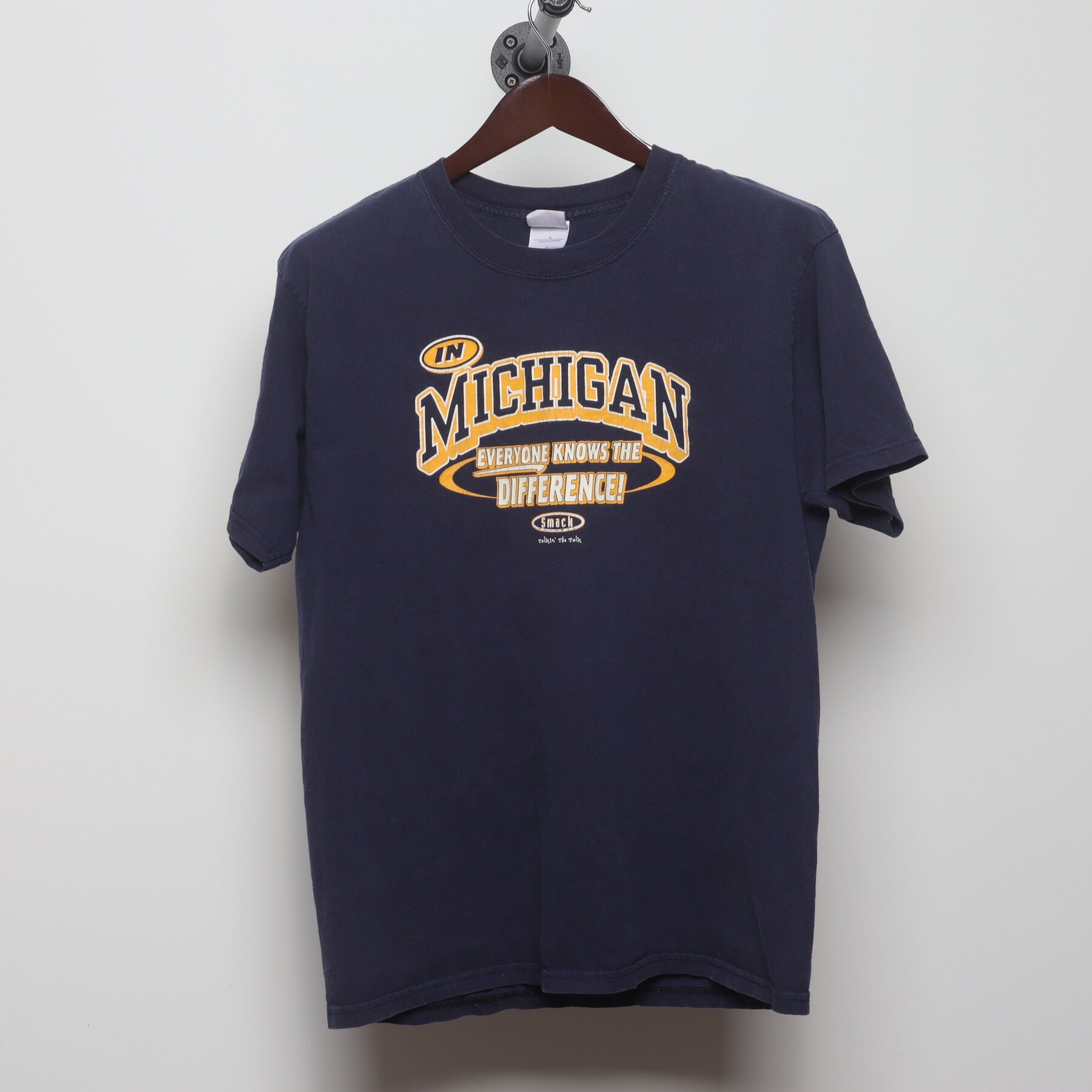 In the world of college football, some rivalries are just built different. This Y2K-era tee is a time capsule of trash talk from just after the University of Michigan's legendary 1997 National Championship season. The front keeps it simple with a bold statement: "In Michigan, Everyone Knows The Difference!" But the back delivers the knockout punch, mapping out the 65 miles and nine national titles that separate Ann Arbor's "Dynasty" from East Lansing's "Wanna-Be." Produced by IBIG—a clever nod to the fan mantra "It's Better In the Big House"—this shirt is a piece of pure, unfiltered Wolverines pride from the Charles Woodson era.