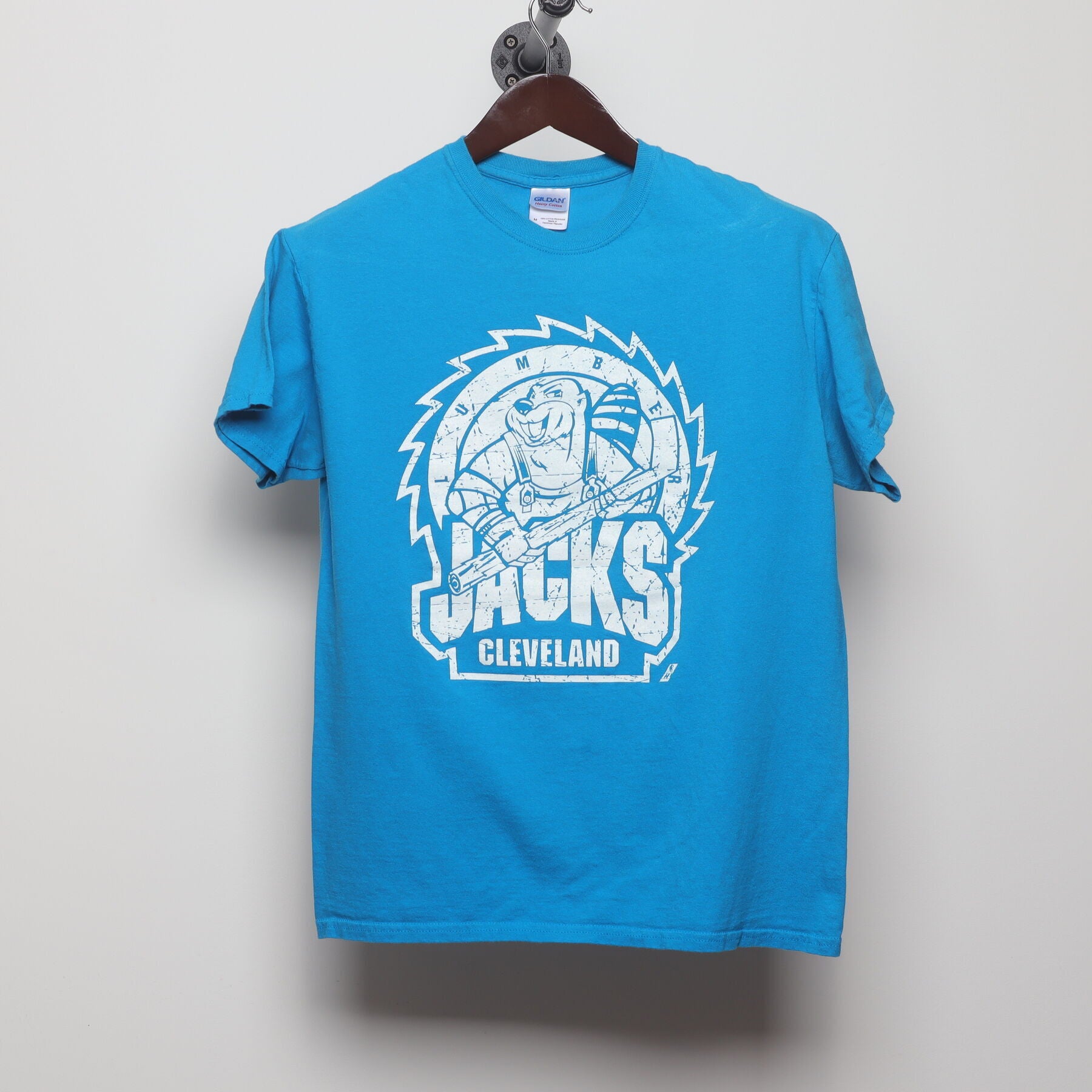 A solid tribute to one of the toughest teams in 90s hockey, the Cleveland Lumberjacks. This shirt perfectly captures the blue-collar grit of the IHL era with its iconic beaver mascot, Jax, wielding a hockey stick inside a buzzsaw blade. The Lumberjacks were a force at the Gund Arena from 1992 to 2001, and their legacy is all about hard-hitting, no-nonsense play. This modern tee features an intentionally distressed graphic, giving it the look and soul of a well-worn original from back in the day. It’s a killer piece for any fan of defunct teams and the golden age of minor league hockey.