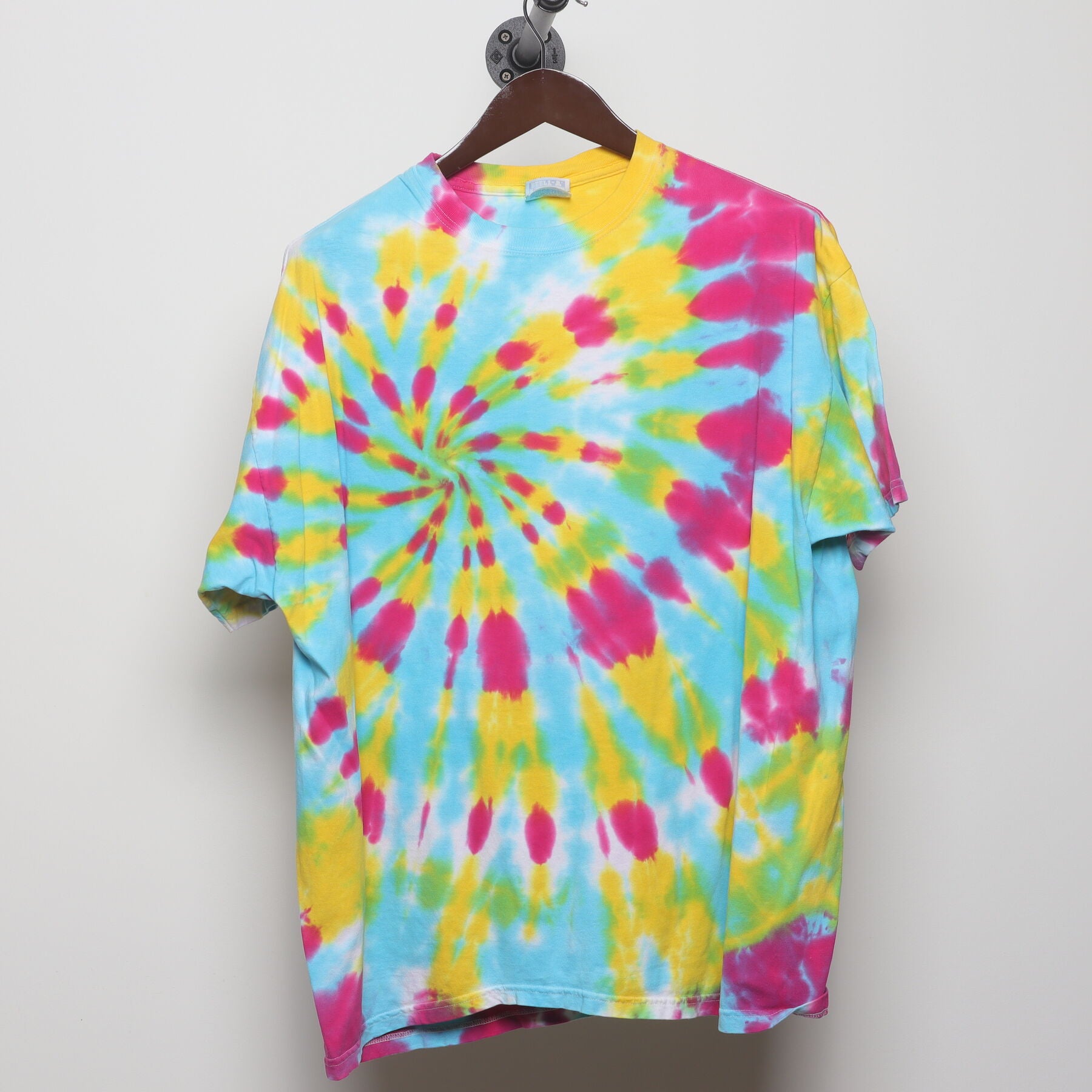 This is the real deal—a quintessential 90s spiral tie-dye that radiates pure, unfiltered energy. Before it was a trend, it was a statement, a burst of psychedelic optimism worn at festivals, raves, and backyard hangouts. The vibrant clash of pink, yellow, and blue captures the vibrant, anything-goes spirit of the decade.